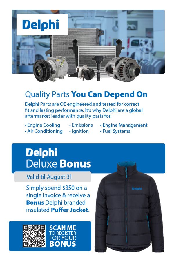 © 2023 Natrad. Offer valid from 1 August - 31 August 2023 for account customers only. 1 Jacket per $350 spent on Delphi parts on a single invoice. Jacket style may vary. Allow up to 3 weeks for delivery from registration. Not valid with any other offer. E&OE.